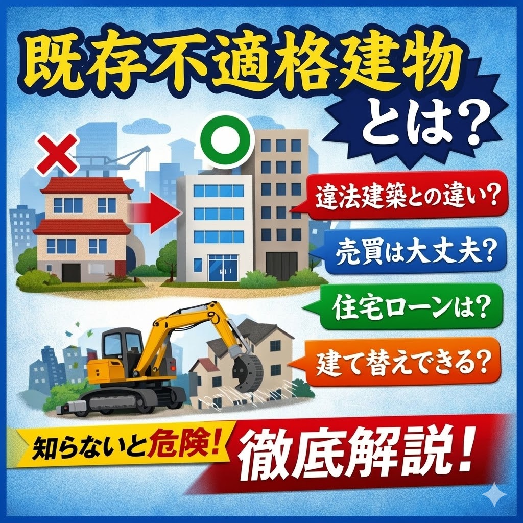 - 【既存不適格建築物とは?】違法建築との違い・売買リスク・住宅ローン・建替え可否まで解説はじめに 不動産の売買や相続、 建替えの相談を受けていると、 よく出てくる言葉があります。… 続きを読む: 【既存不適格建築物とは?】違法建築との違い・売買リスク・住宅ローン・建替え可否まで解説